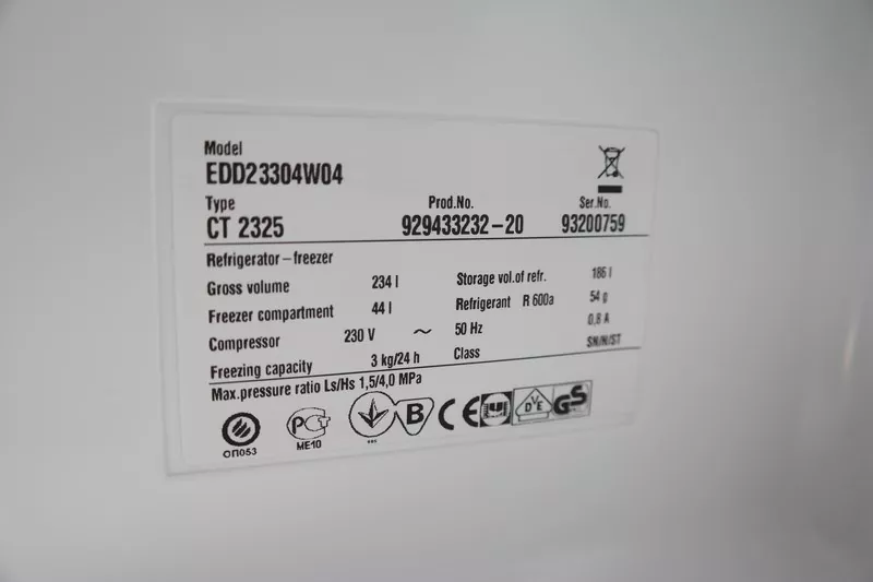 A label on a domestic appliance, functioning as a rating plate.
