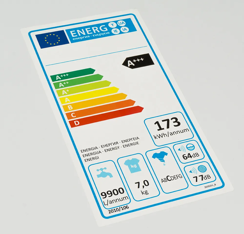 Energy labels are a separate category of appliance labels. These appeared in the 1990s and manufacturers in the European Union countries are obliged to display them. Under EU rules, household appliances are divided into groups, with a slightly different label design for each of them. These include washing machines, dishwashers, refrigerators, ovens, hoods and hoovers, among others. The labels for specific appliances differ in particular in the information they provide. The energy efficiency class (from which they take their name) is common to them all. It indicates the ratio of the energy consumed by the appliance to the standard electricity consumption for its category.